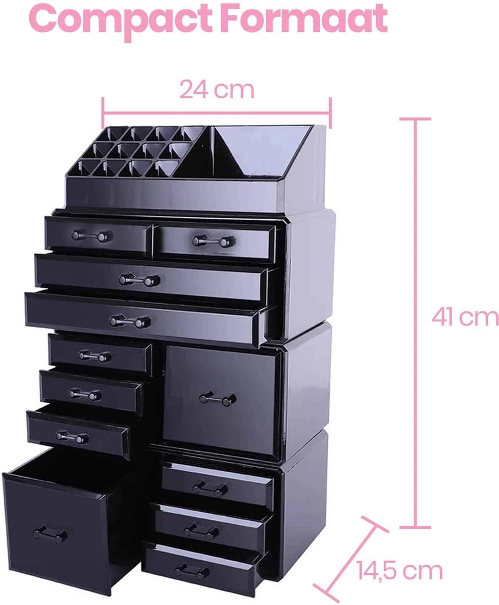 Wil je snel en op een georganiseerde manier al je make-up opruimen? Met de Make-up Organizer met Lagen is snel geregeld. Het heeft meerdere lades en vakken voor grotere dingen. Er zijn grote en kleine lades zodat verschillende groottes make-up erin passen. Door het ontwerp neemt het niet veel ruimte op je bureau, badkamer of kast en het ziet er mooi uit. Ook kun je zelf kiezen hoe de lades en vakken in de Organizer zitten en dus de meest comfortabele lay-out kiezen die je wilt.