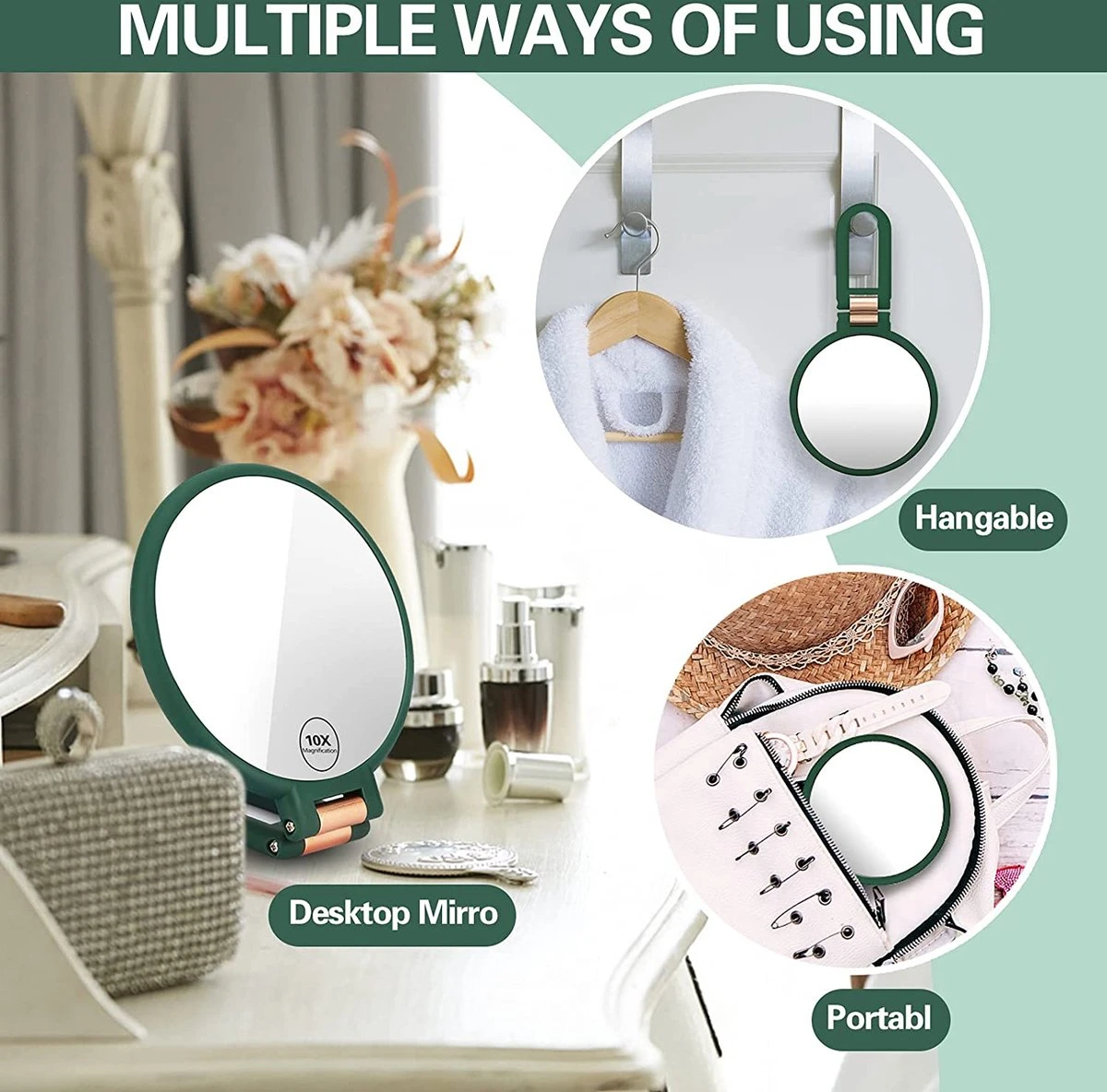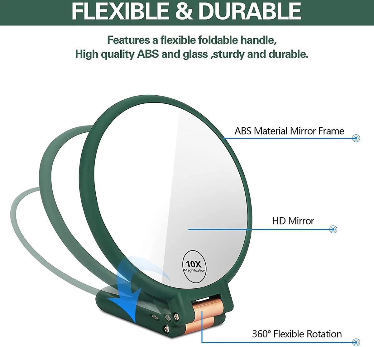 - Dubbelzijdige vergroting: deze draagbare make-upspiegel heeft aan de ene kant een 10-voudige vergroting en aan de andere kant een 1-voudige vergroting. Een uniek dubbelzijdig spiegeldesign is zeer geschikt voor volle make-up, kapsel of scheren, toont een duidelijk visueel effect.