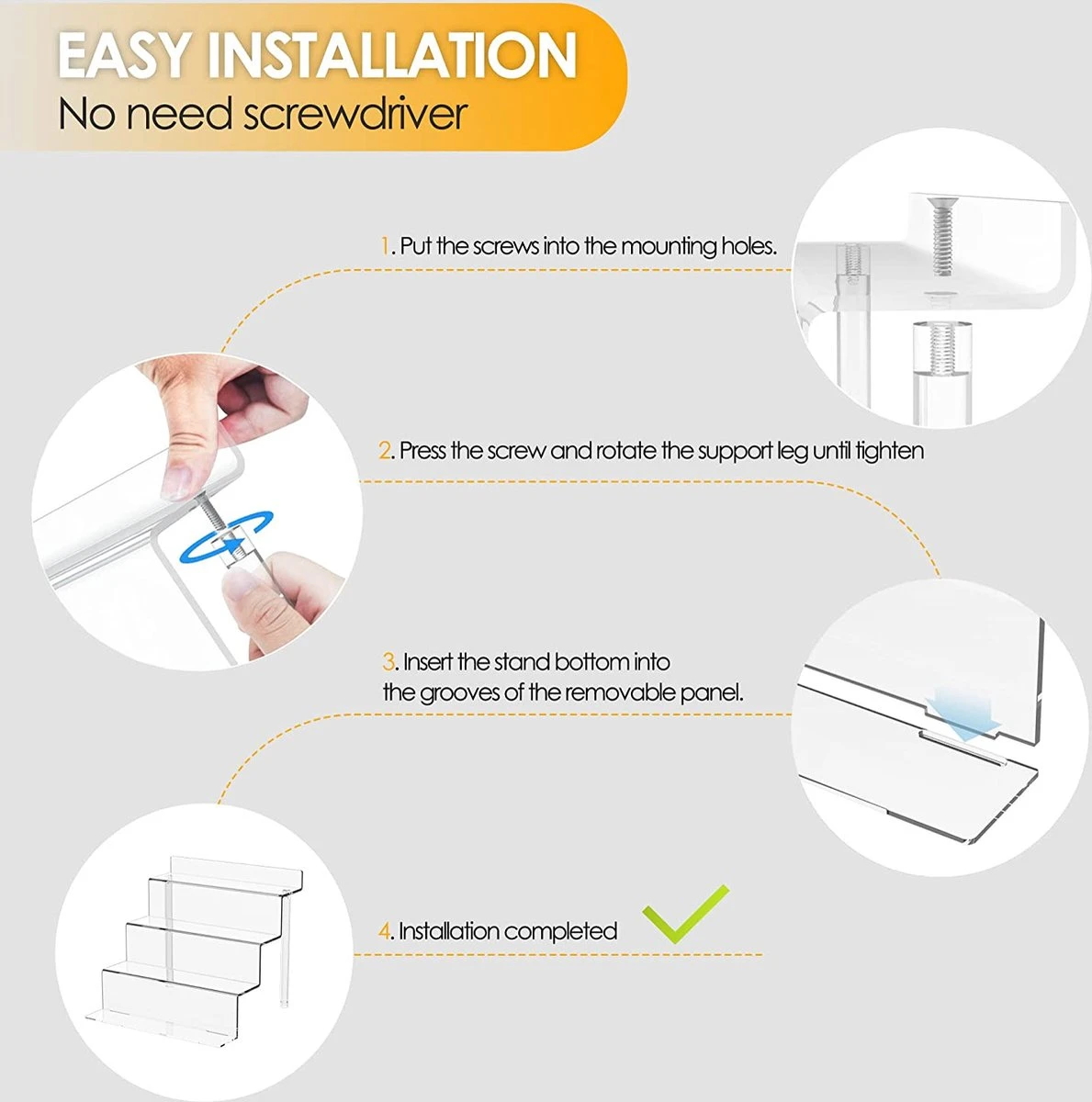 - Eenvoudig te monteren: onze acryl risers kunnen direct met de hand worden gemonteerd (geen schroevendraaier nodig). Schroef gewoon twee poten op de achterkant van elke riser.