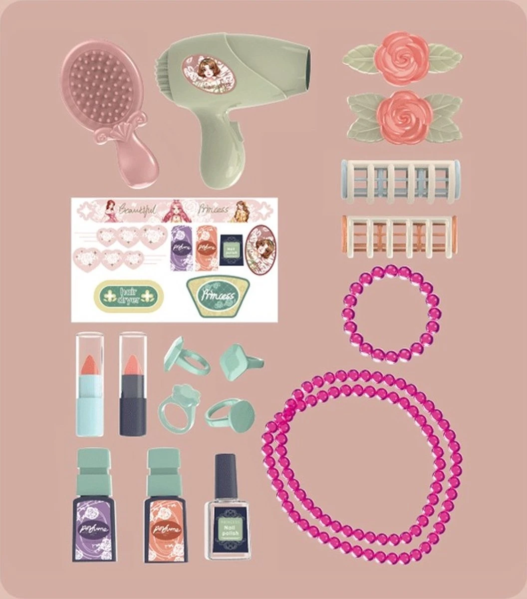 De make up tafel is fel gekleurd met een echte spiegel. Deze kaptafel voor je kind bevat alles waar je kleine prinses van kan dromen. Een geweldig speelgoed voor meisjes die graag spelen in een schoonheidssalon of kapper. Ook andere beauty-gerelateerde details, zoals elastiekjes, spelden of sieraden, kunnen op de kaptafel worden gelegd.