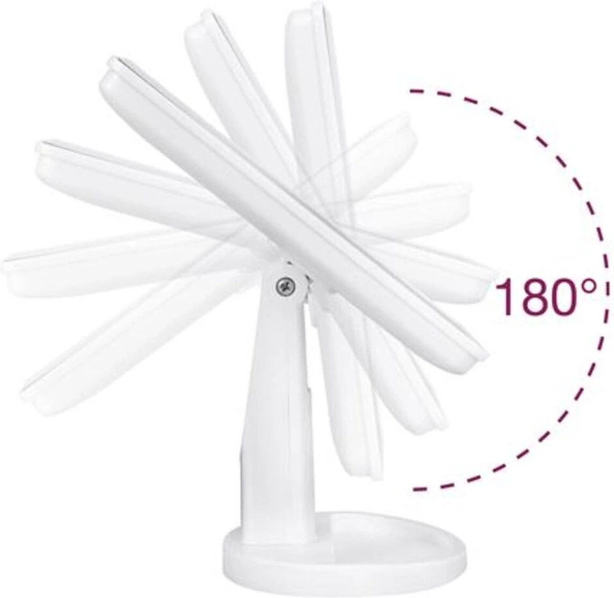 De flexibele make-upspiegel met licht kan 180 graden worden gedraaid, zodat u de beste kijkhoek voor make-up kunt instellen, of u nu staat of zit. De opbergbasis kan kleine cosmetische items opbergen en de tafel schoon houden.